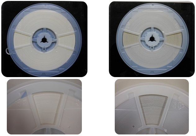 村田MURATA電容公司的紙帶襯紙是全新的載帶襯紙和混合再生紙載帶襯紙結合使用的。白色的襯紙為全新載帶襯紙,灰色的為混合再生紙載帶襯紙。兩者顏色有所不同,但規(guī)格及品質卻并無差異。