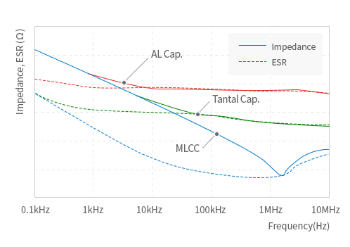 對于MLCC而言,其ESR值通常較低,這也是其被廣泛應用于高頻電路的一個重要原因。特別是在大容量(1μF以上)的情況下,MLCC的ESR值通常只有數(shù)?到數(shù)十?,遠低于鋁電解電容器(AL Cap.)或鉭電解電容器(Tantal Cap.)。這使得MLCC在大容量、高頻應用場合中具有顯著的優(yōu)勢。